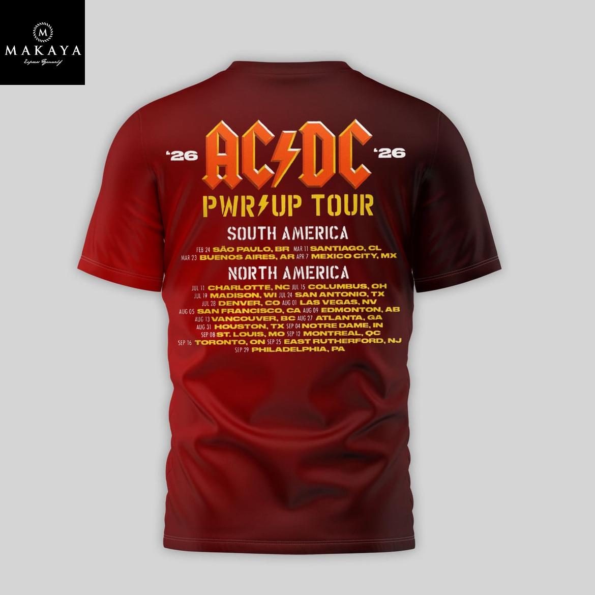 The front showcases the legendary AC/DC logo with powerful silhouettes that capture the raw energy of a live performance. On the back, the detailed tour layout features “PWR/UP TOUR 2026” along with a full list of South American and North American tour locations, making it the perfect keepsake for fans who live for loud guitars and unforgettable nights.